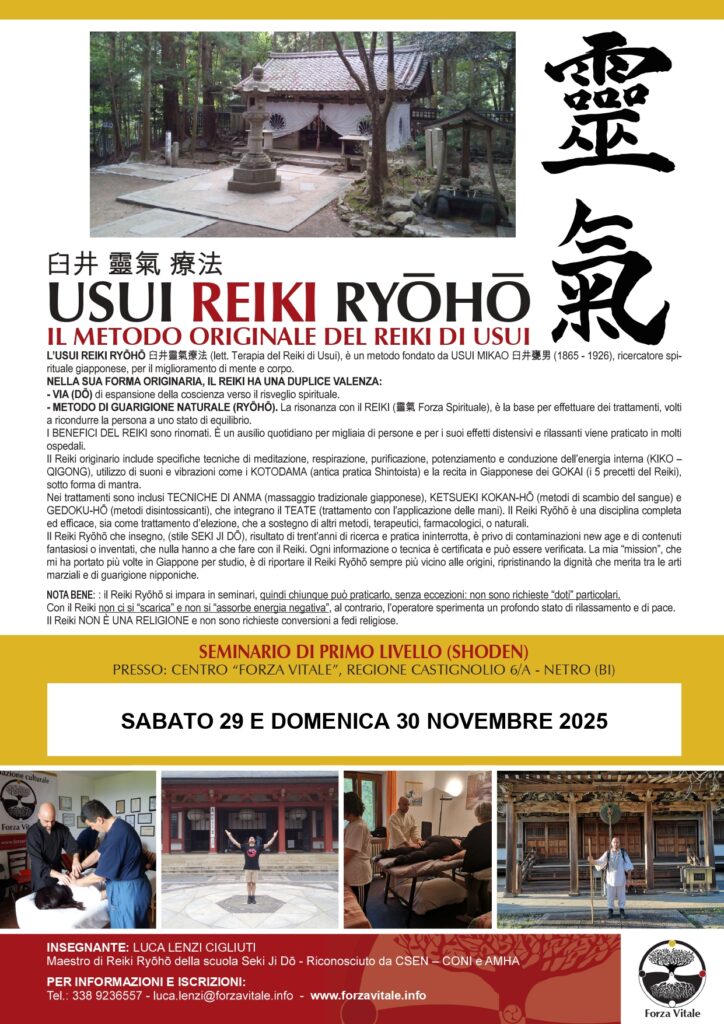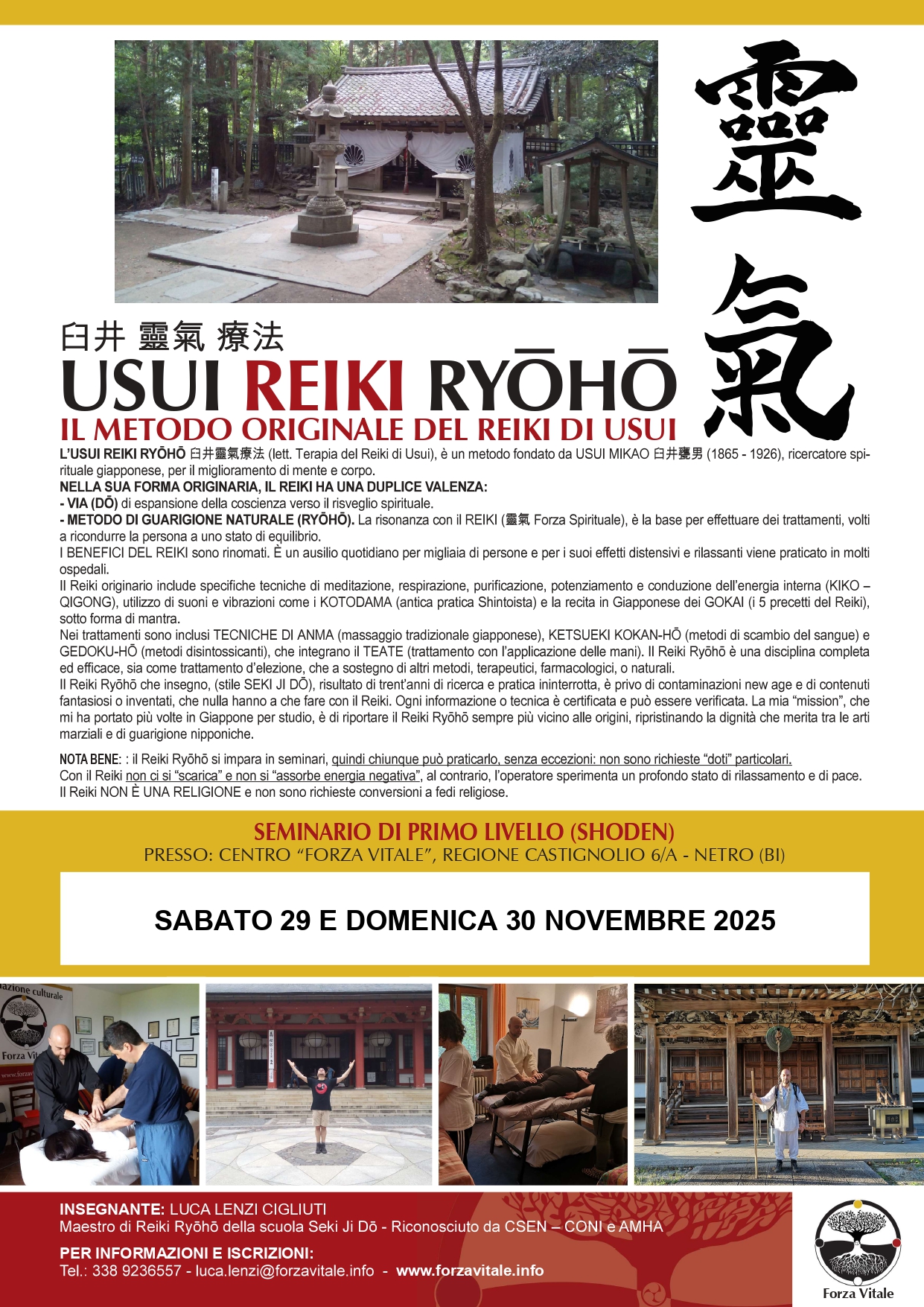 - SABATO 29 E DOMENICA 30 NOVEMBRE 2025 presso il Centro Forza Vitale di Netro (BI), Seminario Shoden Zenki – 1° livello parte 1, di REIKI TRADIZIONALE GIAPPONESE