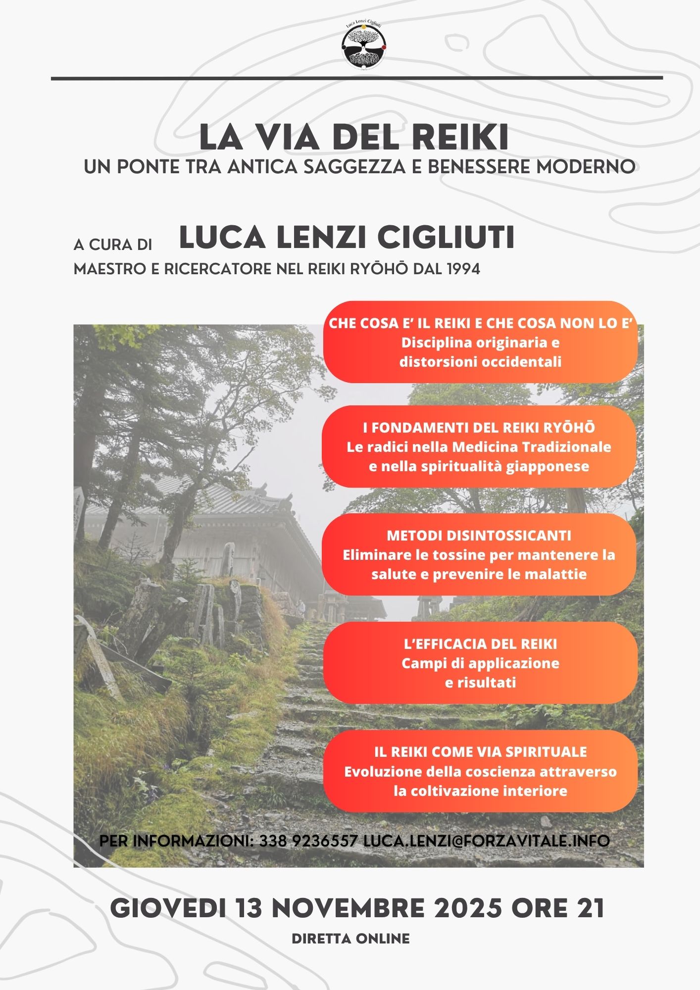 - GIOVEDI’ 13 NOVEMBRE 2025 ore 21, conferenza online “LA VIA DEL REIKI – Un ponte tra antica saggezza e benessere moderno”